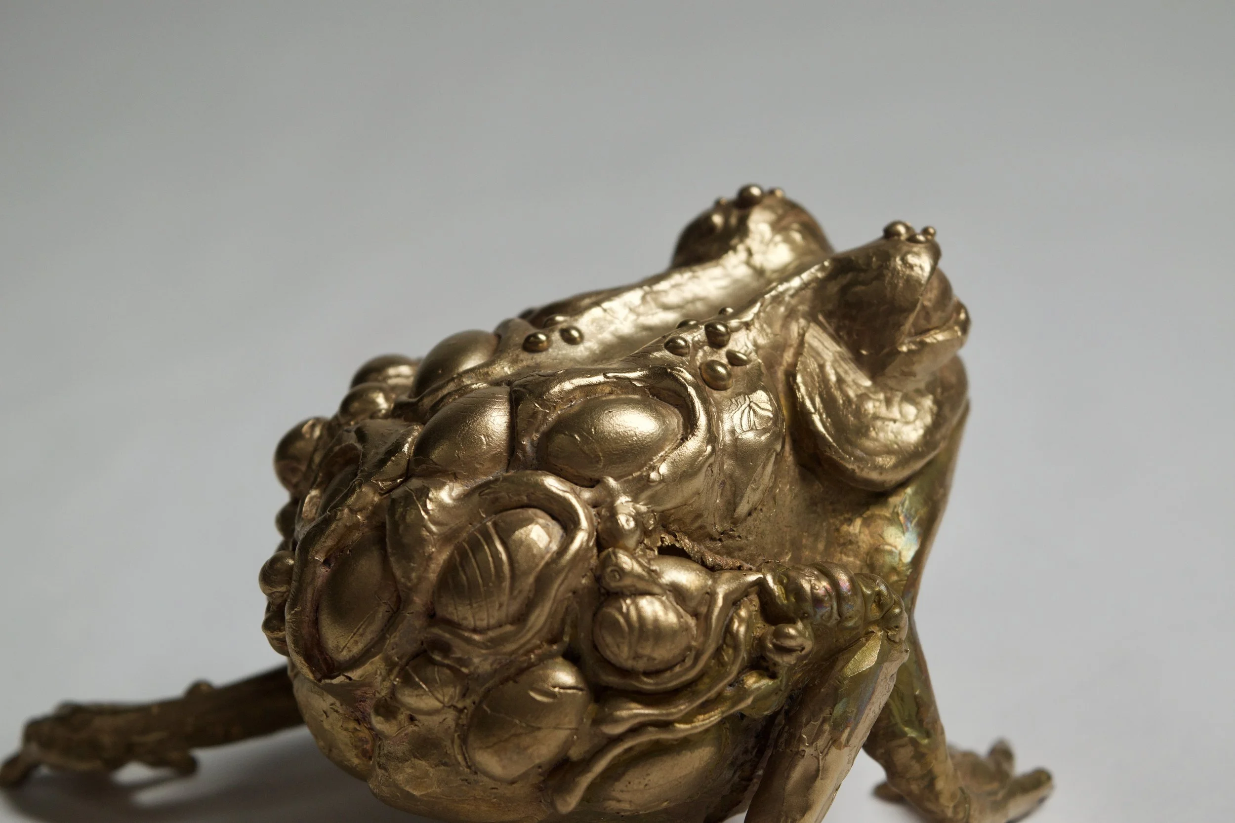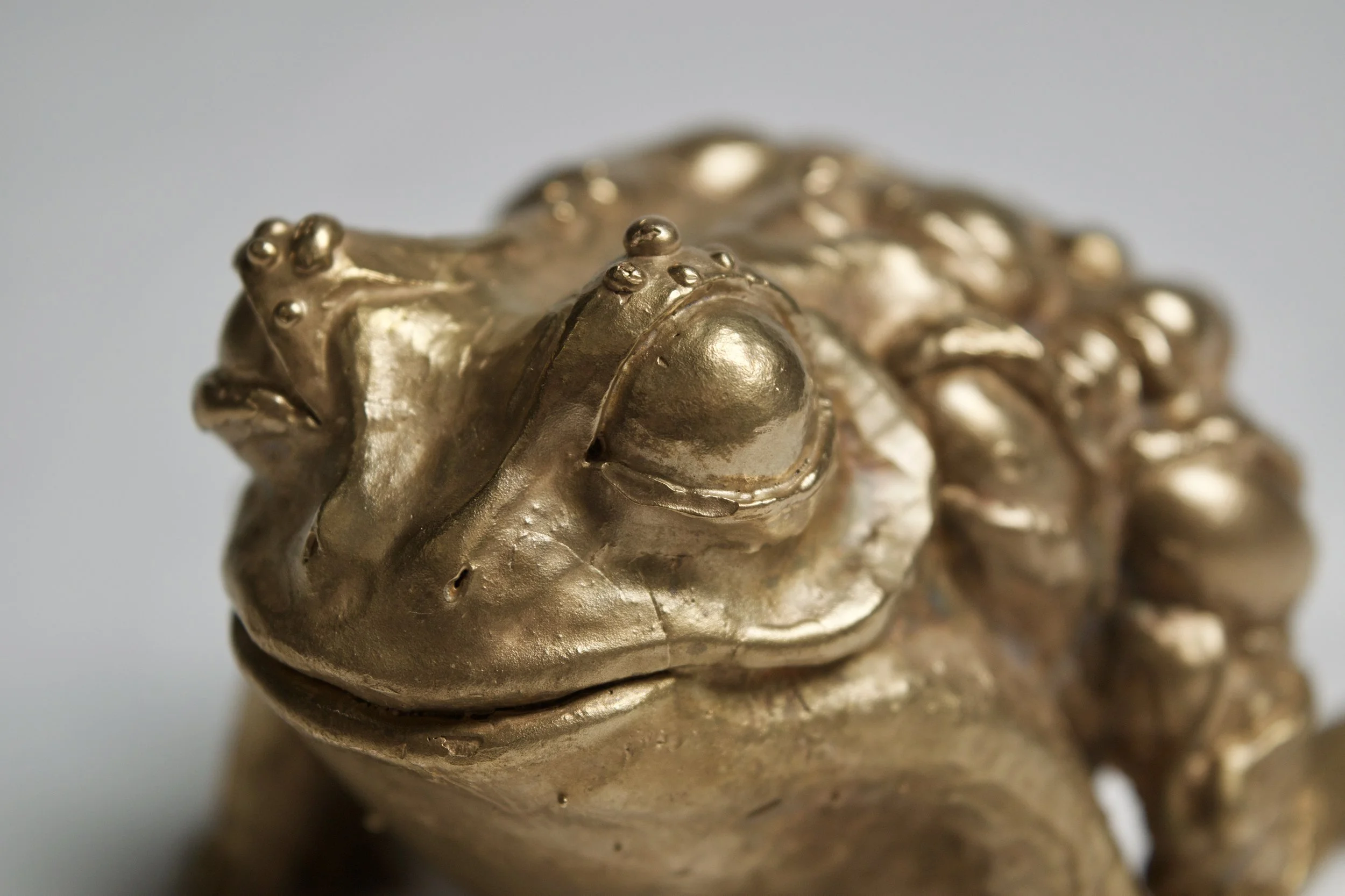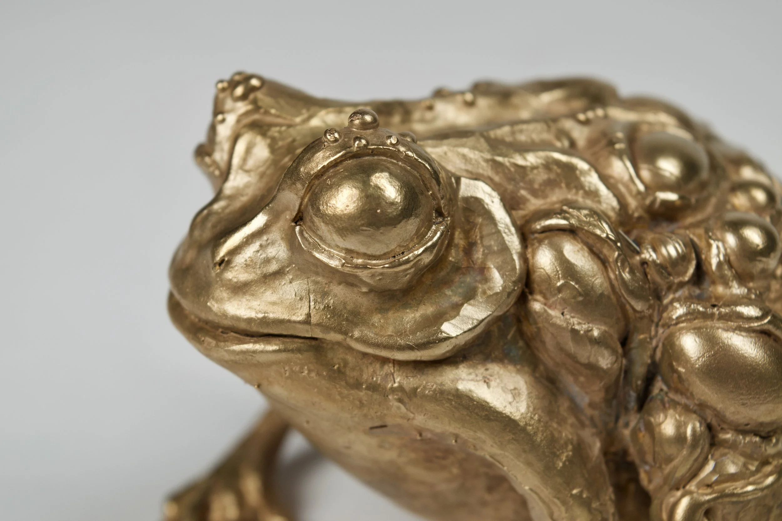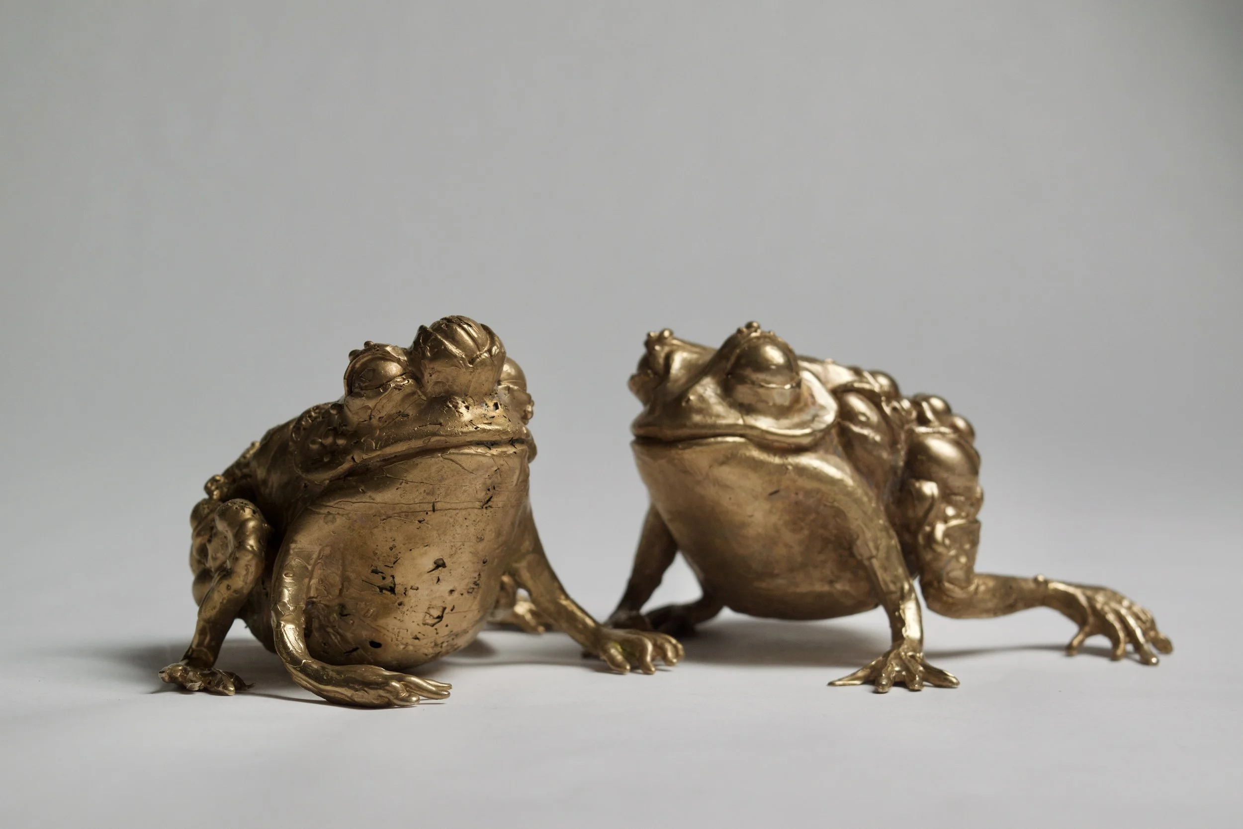 A set of two bronze frogs, originally hand sculpted from wax and created utilizing the lost wax casting process.